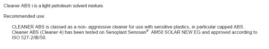 | Description | Cleaner ABS 4 is a light petroleum solvent mixture. Recommended use: Cleaner ABS is classed as a non-aggressive cleaner for use with sensitive plastics, in particular capped ABS. Cleaner ABS (cleaner 4) has been tested on Senoplast Senosan AM50 SOLAR NEW EG and approved according to ISO 527-2/IB/50. |